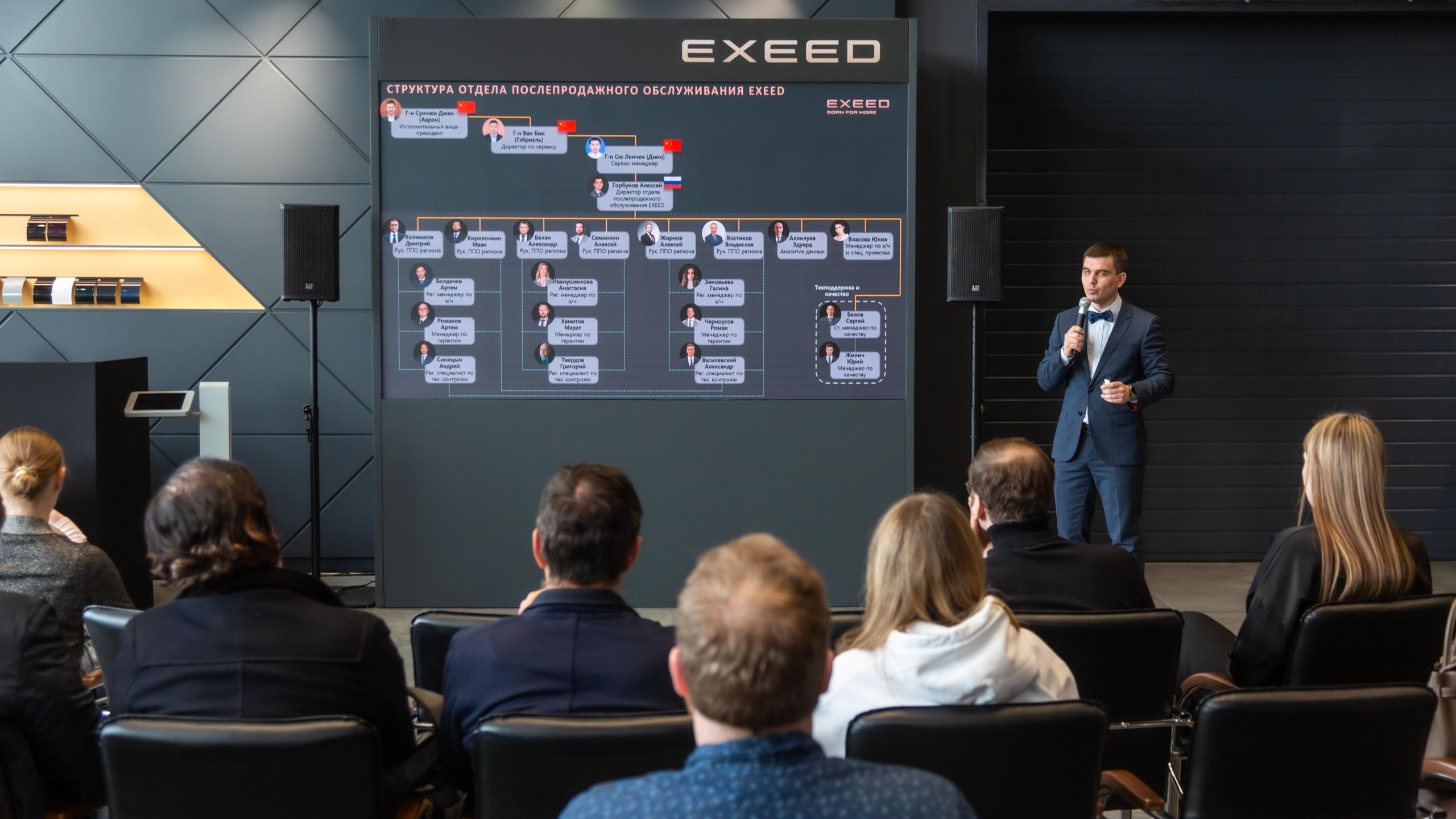 Директор отдела послепродажного сопровождения EXEED Горбунов Алесей ознакомил гостей и владельцев EXEED о действующих сервисах, приоритетах послепродажного обслуживания, конкурентных преимуществах и отличительных особенностях сервиса EXEED на российском рынке, в том числе проинформировал о будущих проектах и создании экосистемы сервисных услуг для владельцев EXEED. Для клиентов был организован тест-драйв всего перечня моделей EXEED, включая флагманские модели EXEED VX FL и EXEED RX. Более того, клиенты смогли поучаствовать в одном из наиболее запоминающемся событии - выдаче клиенту нового автомобиля, и еще раз прочувствовать торжественную атмосферу приобретения автомобиля.
